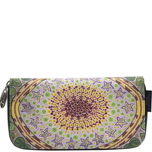 This wonderful nickel zip around, clutch style wallet is created in a screen printed ‘leather look’ material and is featured in our Aboriginal Womens Artists Project collection. Shown here in Cheryl Thompson's wonderfull Bush Tomatoes painting.